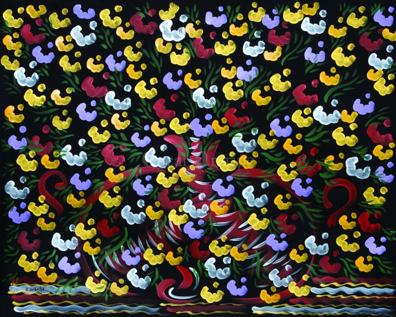 A tela mostra uma rica combinação de cores, onde o preto do fundo explode num clarão azul, realçado pelas flores vermelhas, amarelas e azul piscina. Belíssima obra!