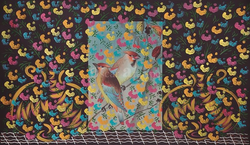 A tela mostra uma rica combinação de cores, onde o preto do fundo explode num clarão azul, realçado pelas flores vermelhas, amarelas e azul piscina. Belíssima obra!